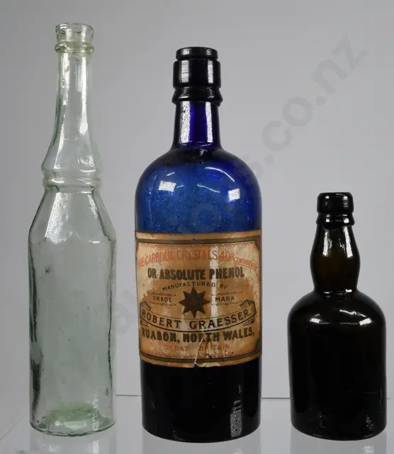 ASSORTED BOTTLES, GOLDFIELDS OIL, BLACK GLASS, BLUE