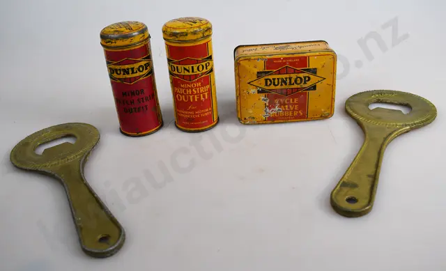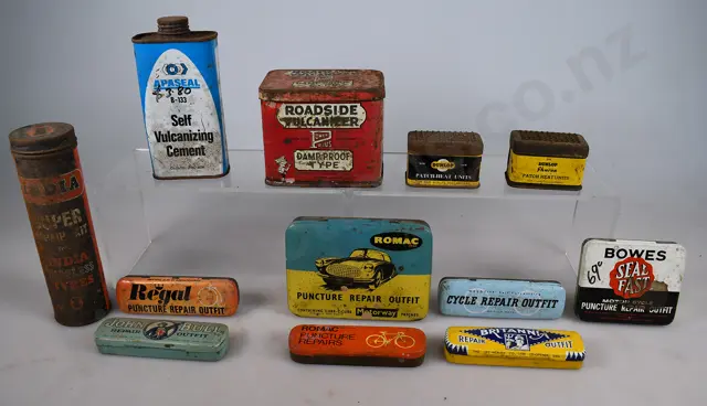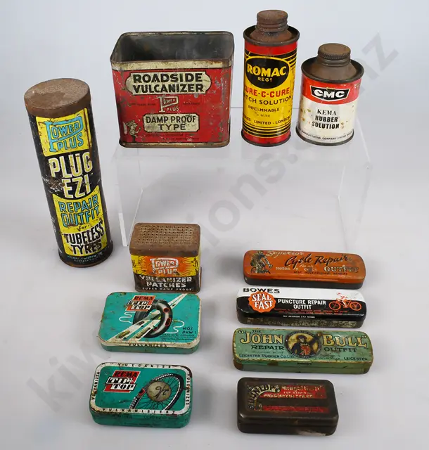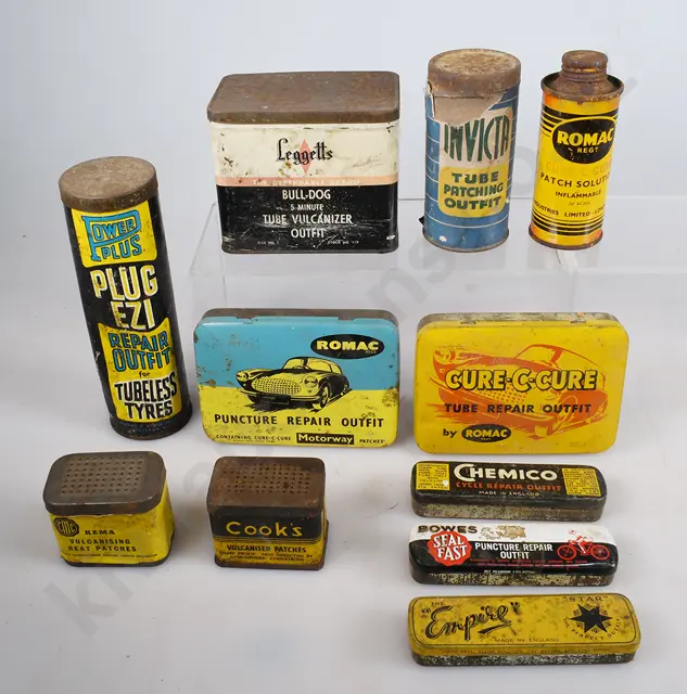 76mm tall Shaler Hot Patches with paper label Goodrich Self Vulcanizing Patch, paper label Pocket Vulcaniser "SYRO Cycle Tubes 235mm long Dunlop bottle opener 115mm long repair kits, John Bull, Romac, 2 x Bowes assorted small tins, 4 x John Bull, Schrader all tins have surface rust, some fading, marks/wear, minor dints, Good 7/10 (13)