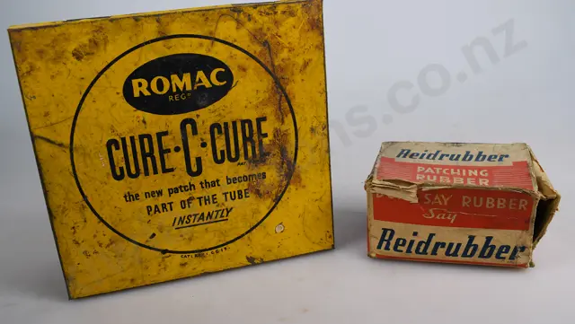tallest is 140mm tall cardboard cylinder, UDS United Distributors Service, On The Wheel Repair, Tubeless Tire Repair Plugs, Made In U.S.A., small dint lower rear, minor marks, light surface rust to top, Very Good 8/10 plus Dunlop 'Minor' Tube Repair Outfit, light surface rust, minor paint loss, wear, Good 7/10 plus 130mm x 95mm tin, Romac Cure-C-Cure Tube Repair Outfit, with contents, minor marks, light scratches, surface rust/paint loss, Good 7/10 plus 112mm long John Bull Repair Outfit, light scratches, surface rust/paint loss, Good 7/10 (4)