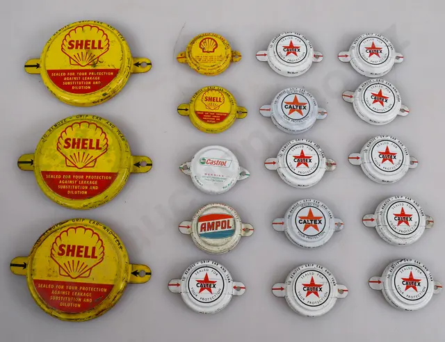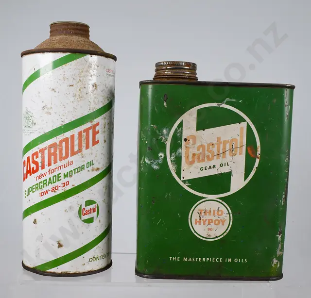 283mm tall Shell Motor Oil Triple F S.A.E.50, Shell logo impressed into top, handle has separated at one end, light scratches and wear, light surface rust, Good 7.5/10 plus 95mm tall Shell Net 500g, grease tin, minor marks, some unevenness to lid, minor surface rust, Very Good 8.5/10 (2)