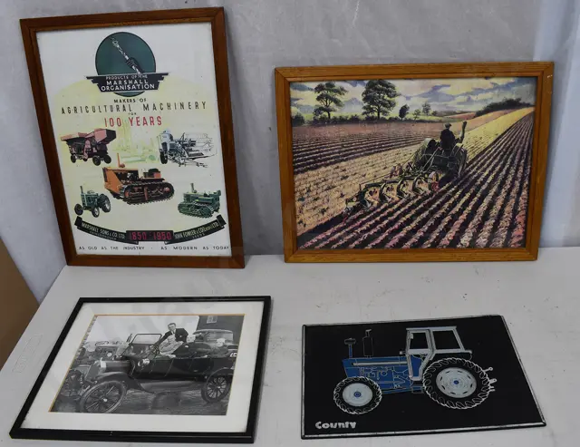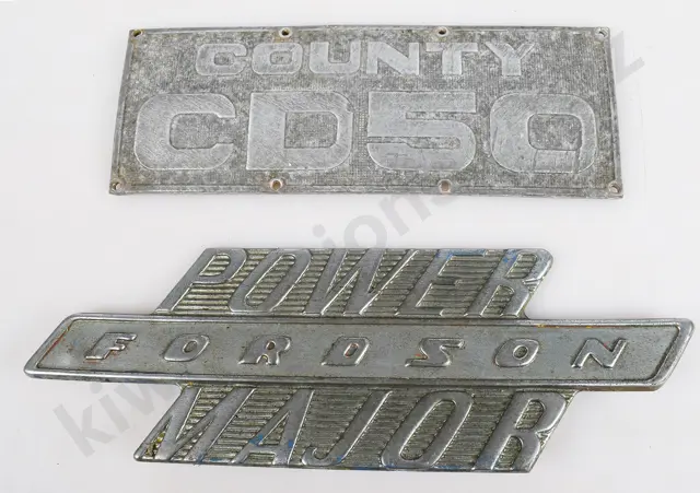 515mm x 255mm light pressed tin wall clock sign, Ford New Holland with clock to one section, and The Assurance Of Ford New Holland Parts to the other, untested, minor marks, Very Good 8/10 plus 457mm x 255mm plastic sign Genuine County Spare parts, damage to 3 of the corner fixing holes, spotty marks, Good 6.5/10 plus 600mm x 158mm core flute signs, Ford in blue, New Holland in red, some fixing holes, minor marks, Very Good /10 (4)