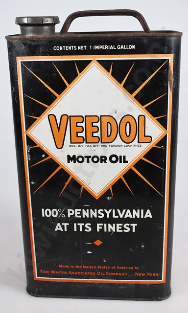 Veedol Oil Tins Left to right, 300mm tall Veedol Motor Oil, 1 Imperial gallon, 100% Pennsylvania At Its Finest, Made In The United States Of America by Tide Water Associated Oil Company.... New York, surface rust, light scratches and wear, minor dints, Very Good 8/10 plus 245mm tall, Veedol Motor Oil, From Refinery To Consumer, 1 Imperial gallon, Made In The United States Of America by Tide Water Associated Oil Company, Packed In New Zealand By Simms Jones Ltd, needs a clean, died oil over sections, light surface rust, light scratches and wear, minor dints, Good 7/10 plus 142mm tall Veedol Motor Oil, 1 Liquid U.S. Quart, 100% Pennsylvania, Made In The United States Of America by Tide Water Associated Oil Company, New York, tear top that's been opened, light surface rust, minor scratches, Very Good 8/10 (3)