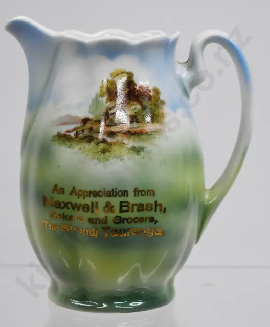 142mm tall, two tone stoneware jug, transfer print With the Compliments of John Gold & Sons Aerated Water Manufacturers & Bakers Balclutha & Milton, Awarded 30 medals, Price Bristol potter, professional repair to rim edge, minor marks, Good, 7.5/10