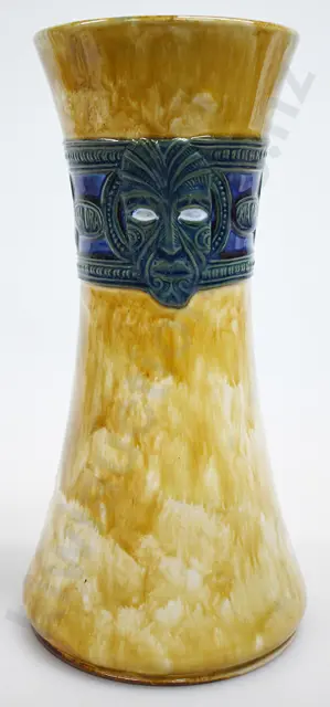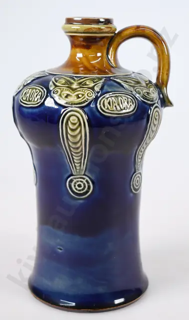 210mm long, very unusual and eye-catching Royal Doulton-made stoneware footwarmer that has raised sprigs depicting a chick, cockerel, toy soldier and two pine trees as well as a circular motif with the word 'Baby' within, and an image of a Baby. Lovely mottled blue glaze, with matching internal screw stoneware stopper (with original rubber washer). Typical Doulton quality, Very Good 9.5/10