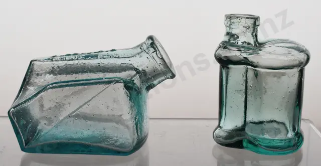 218mm tall to top of glass tube, Dr Nelson's Improved Inhaler Directions for use Remove mouthpiece - half fill inhaler with boiling water, drop remedy on sponge of mouth-piece - apply lips to it - breathe freely in & out as in ordinary full respiration - when only the vapour of hot water or any infusion is desired remove the sponge from mouthpiece small nibble to underside of mouthpiece, 40mm hairline from rim edge, small rim edge glaze rub, crazing, Very Good 8/10 plus 143mm tall version, has cork but no glass tube, with less detailed instructions, SS to base, Very Good 9/10 (2)