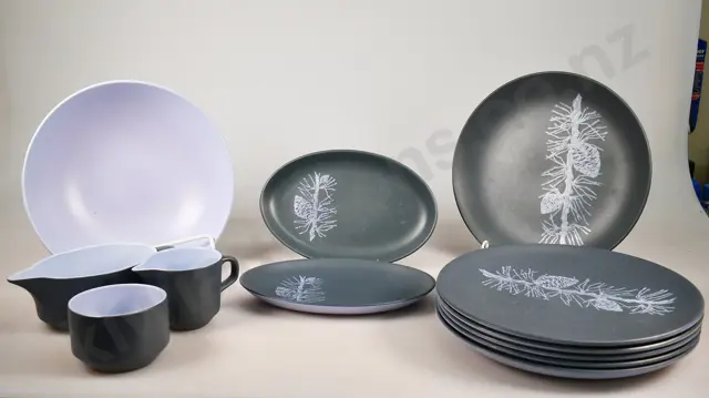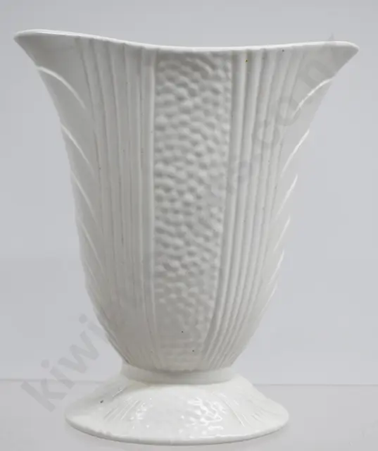 62mm tall x 290mm long x 97mm wide Crown Lynn, Oval Squat Trough Vase with Vertical Lines in green/cream glaze, 74 & fraction marks to rear, minor marks, Very Good 8.5/10 plus 90mm tall Crown Lynn number 21 vases from the Ambrico period, 1940's-1950's, green glaze, fraction marks to the base, minor marks, Very Good 8.5/10 plus 70mm tall Crown Lynn mini, cream with touches of grey/green, Very Good 9/10 (3)