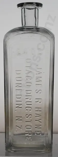 Left to right 3 x, 180mm, 164mm, 152mm tall H. Poole Dispensing Chemist Kaikorai Dunedin all M (Maws) maker, all have miner internal haze, minor marks, some rust marks on smallest size, all Very Good 8/10 plus 2 x 155mm, 112mm tall J.H. Reynolds Dispensing Chemist Roslyn, no maker, minor internal haze on the taler one, minor marks Very good 8/10 & 8.5/10 (5)