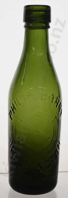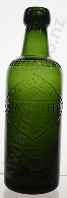 Palmerston North 10oz Internal Threads, JW 28, aqua Bell & Co Palmerston N NZ with Bell Trade Mark, number 4 to base, rim edge glass fault that looks like a chip but is in the making, light wear, Good 8.5/10 plus JW 54, green, Dixon's Palmerston North, Anchor Trade Mark, 4 to base edge, rim edge chip, minor scuffs & marks, Good 7.5/10 (2)